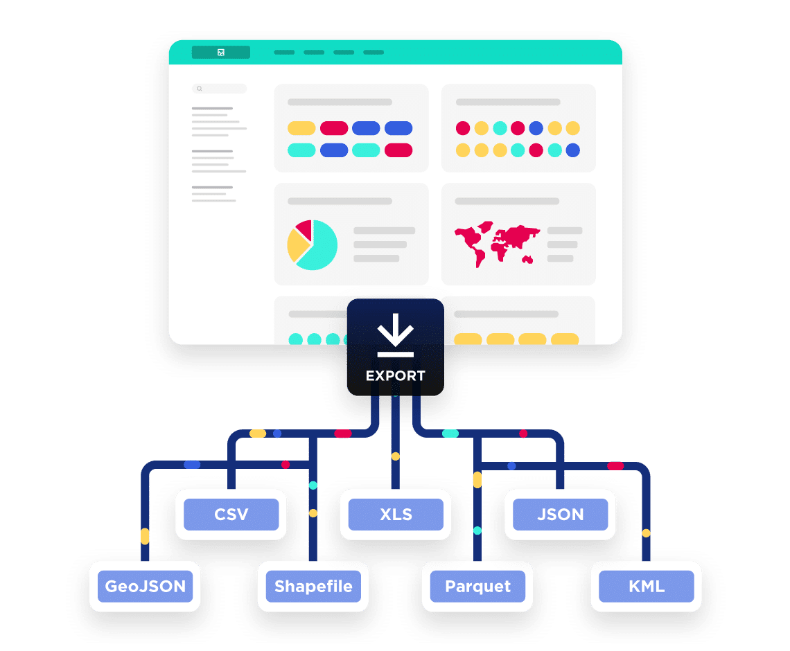 Export your data assets in a variety of file formats, from standard JSON to Parquet, as well as CSV, XLSX, GeoJSON, Shapefile, and many more.