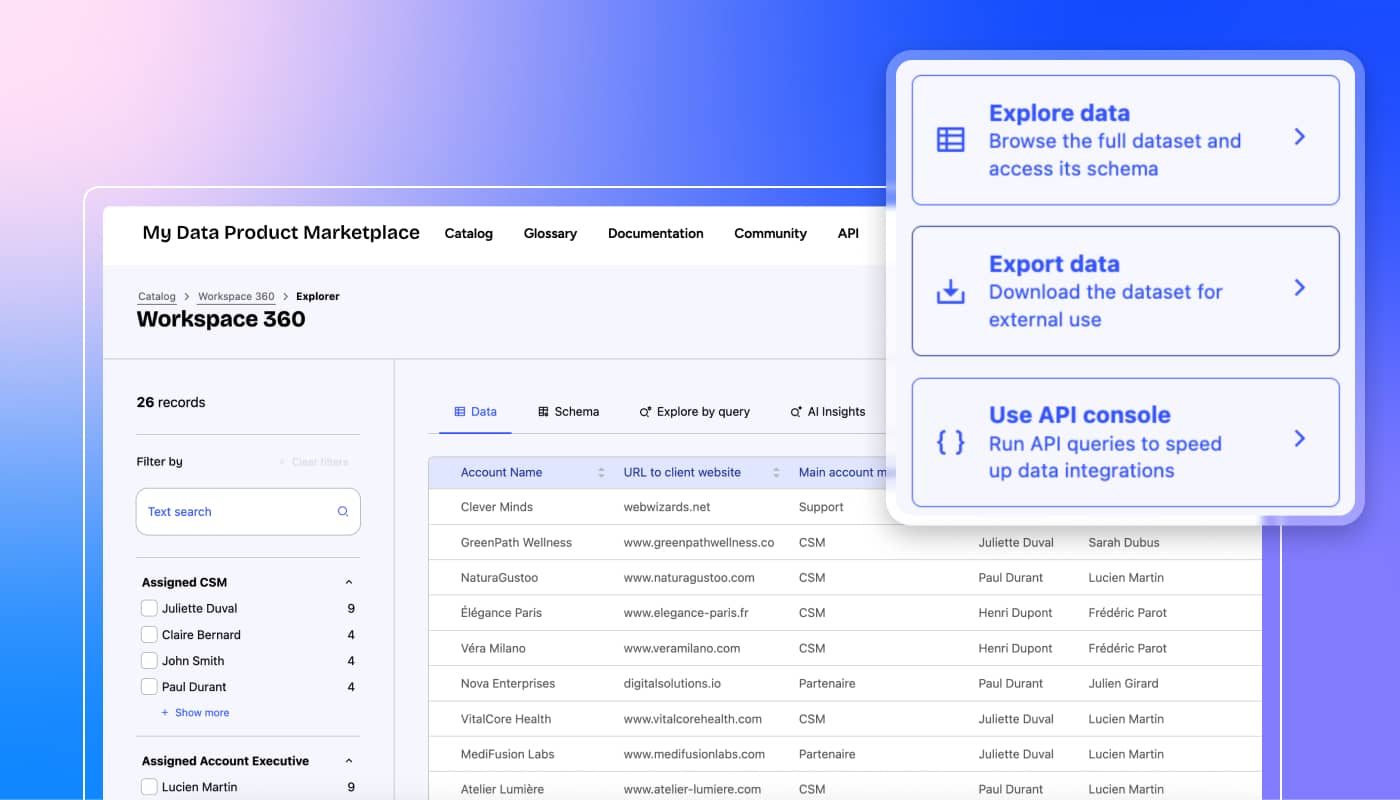 Our data portal solution enables you to effortlessly industrialize internal and external data sharing through a range of export formats and channels.