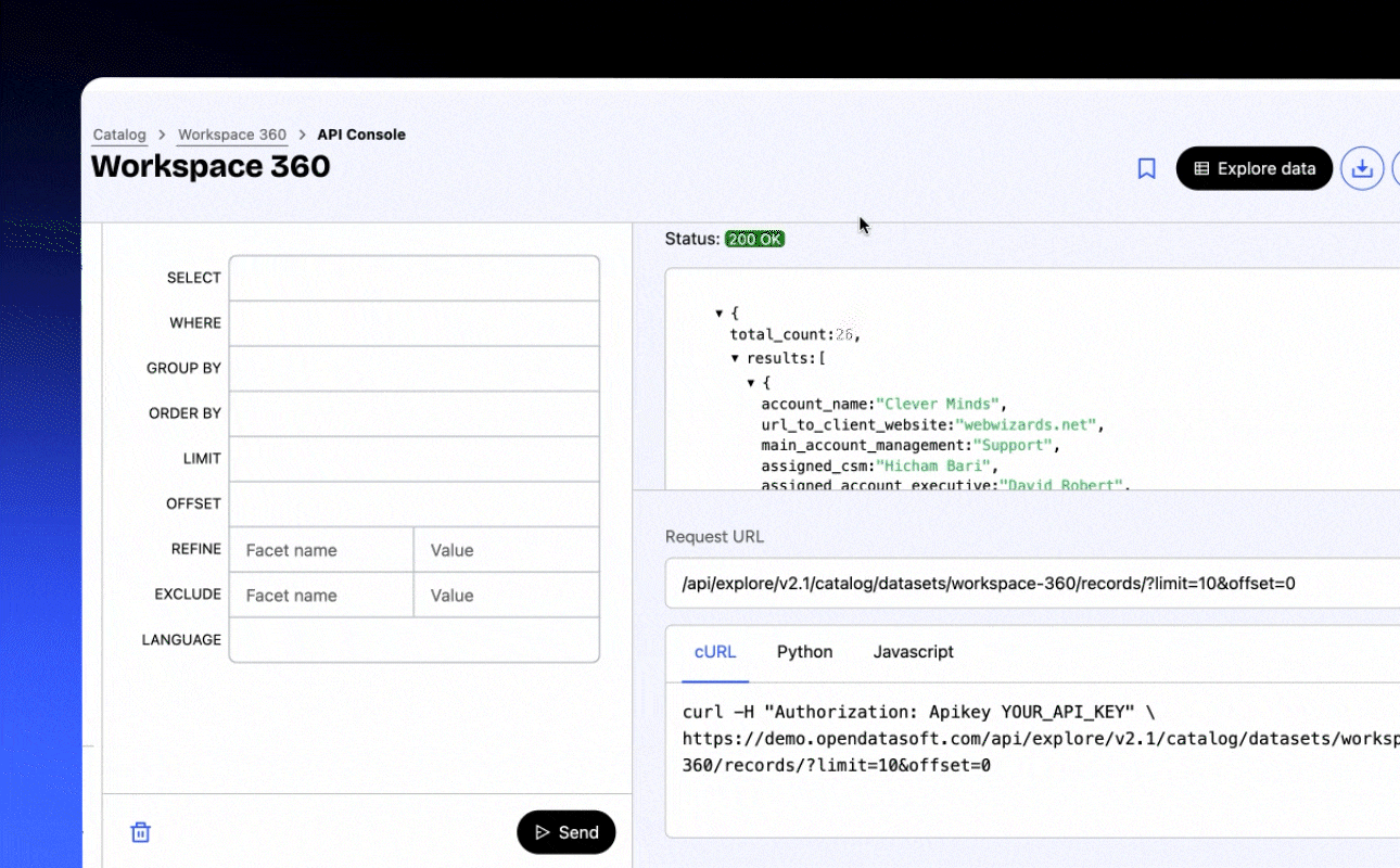 Enable non-technical users to perform API queries in just a few clicks at a dataset level simply by selecting filters or filling in parameters within the API console.