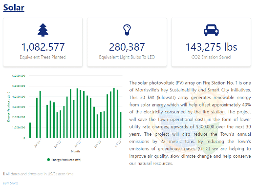 For example, the Town of Morrisville in North Carolina has created a sustainability data story for its citizens on its portal. This includes information on its use of solar power, highlighting emissions reduction and financial savings.