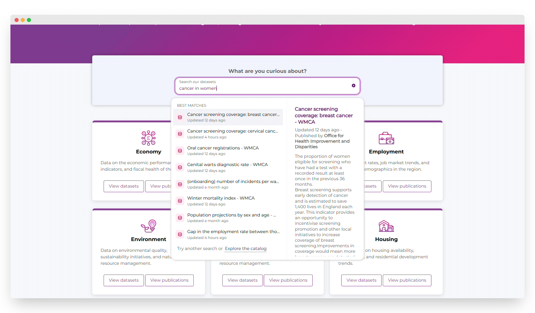 The AI-powered search means users can search more naturally, and it understands context as well as keywords. For example, you can type in something like ‘green energy and CO2,’ and it’ll show you all the results it thinks are a really good match—and even similar datasets which might also be of use.