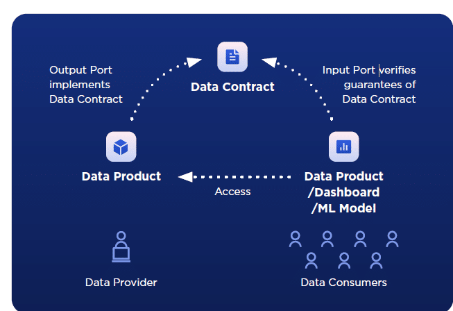 The data contract contains output and input ports. An input port describes the data a consumer expects (format, structure, rules), while an output port describes the data a producer provides. The contract links the two to ensure that the data exchanged meets expectations.
