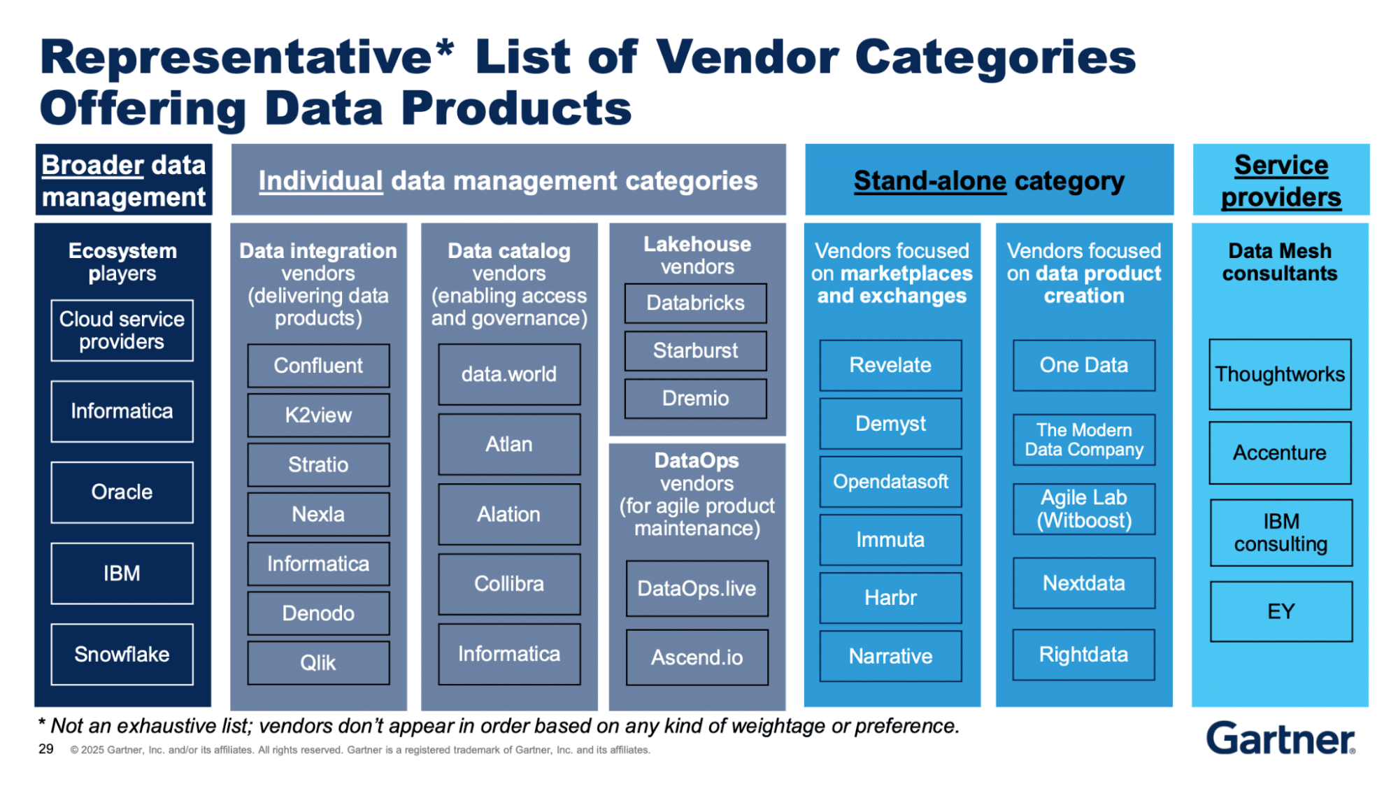According to Gartner, the data marketplace market is still nascent, emerging as buyers embrace data products and shift away from strategies that are focused on technical data governance. It lists a range of vendors and types across the data product ecosystem from those offering broader data management solutions to consultants and service providers. However, many existing solutions have added data products onto legacy systems, meaning they cannot deliver tailored functionality. Other new players are too narrow or service-dependent.