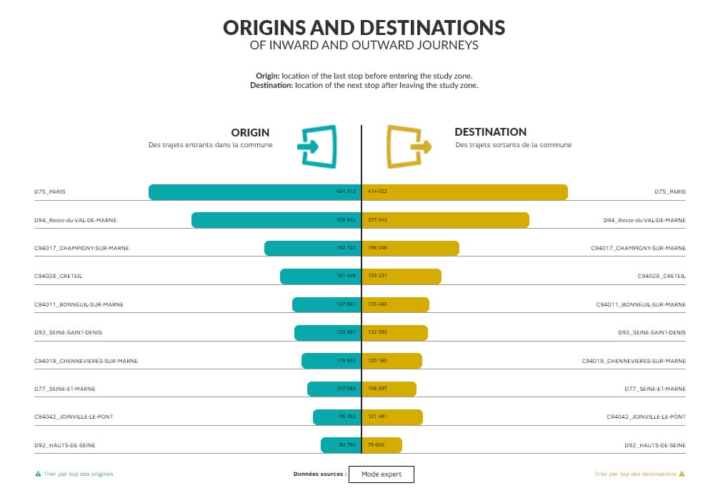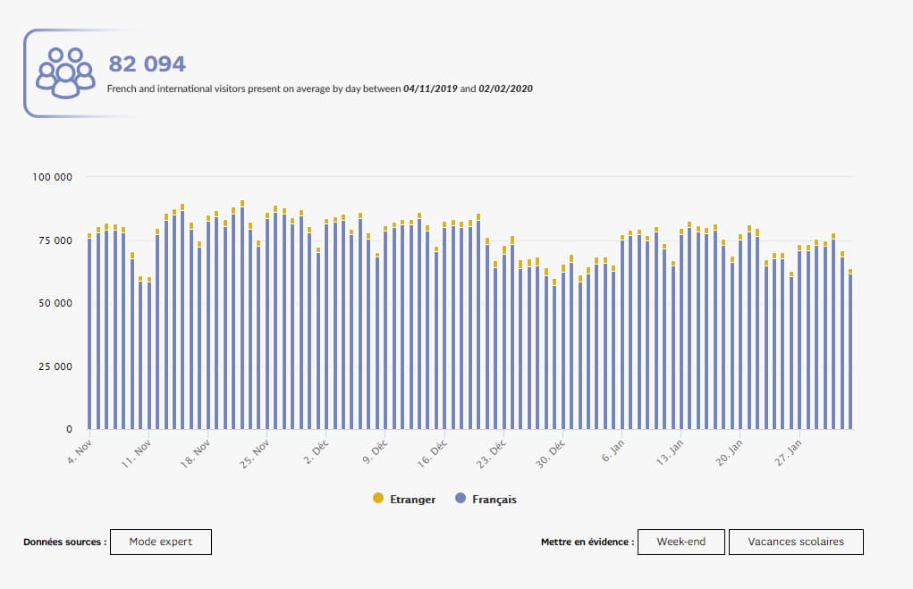 We then developed indicators to meet the needs of local authorities (place of residence of visitors, origin-destination matrix, etc.), tourism professionals (distinction between tourists/day trippers, starting point of visitors, length of stay, etc.), event organizers (average time spent by visitors, etc.), and retailers (customer catchment area, recurring visitors, etc.).