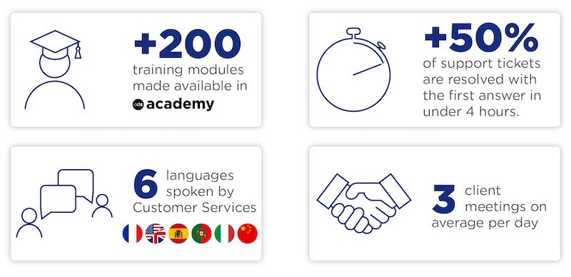 The Customer Service team is made up of Customer Success Managers (CSM), who are in direct contact with customers and their projects; Digital Learning Managers, who are constantly adding new learning resources to our Academy inspired by the use cases communicated by the CSM; and Technical Project Managers, who are capable of resolving our customers’ complex problems and personalization requests.