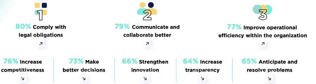 These findings reflect the main challenges facing organizations involved in data projects: improved internal collaboration around data; the need for transparency; and a desire to improve products and services to create additional revenues.