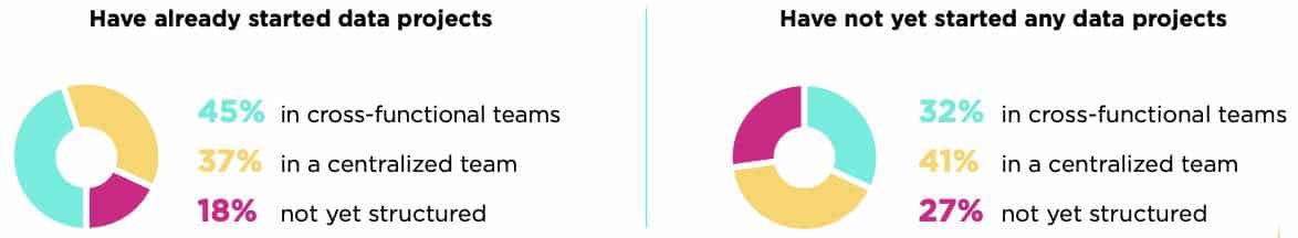 On the other hand, organizations already involved in data projects are mainly organized in cross-functional teams, with experts integrated into each team. The benefits of doing this are better communication, alignment with a single global data strategy, and the sharing of internally acquired knowledge.