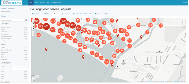 Every dataset on the City of Long Beach’s open data portal contains interactive dashboards showing the data visually, ensuring it is appealing and understandable at a glance. For example, its Go Long Beach Service Requests dataset shares information on all service requests received through the city’s 311 app, covering areas such as incidents of graffiti, potholes or dumped items. Displayed via an interactive map, users can see local incidents as well as look at trends, such as time to closure, in order to highlight areas for improvement.