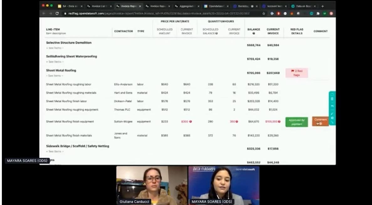 This is how BA came to partner with Huwise to develop the Red Flag Software Tool, an instrument that allows cities to spot discrepancies between payment amounts agreed in contracts and incoming invoices. “In the main page project managers find an overview of the budget, schedule, and number of red flags attached to their projects” shows Mayara from the Huwise team during a demo of the software. “The Invoice Summary helps them monitor the status of all invoices received and spot those that are flagged, while the Invoice Report shows the exact overcharges and enables project managers to take action by either approving or stopping payments. Lastly, the Project Report provides aggregated data on project indicators to facilitate decision-making” continues Mayara. “What we love about this tool is that it brings together the best of the human and the best of the machine” concluded Giuliana.