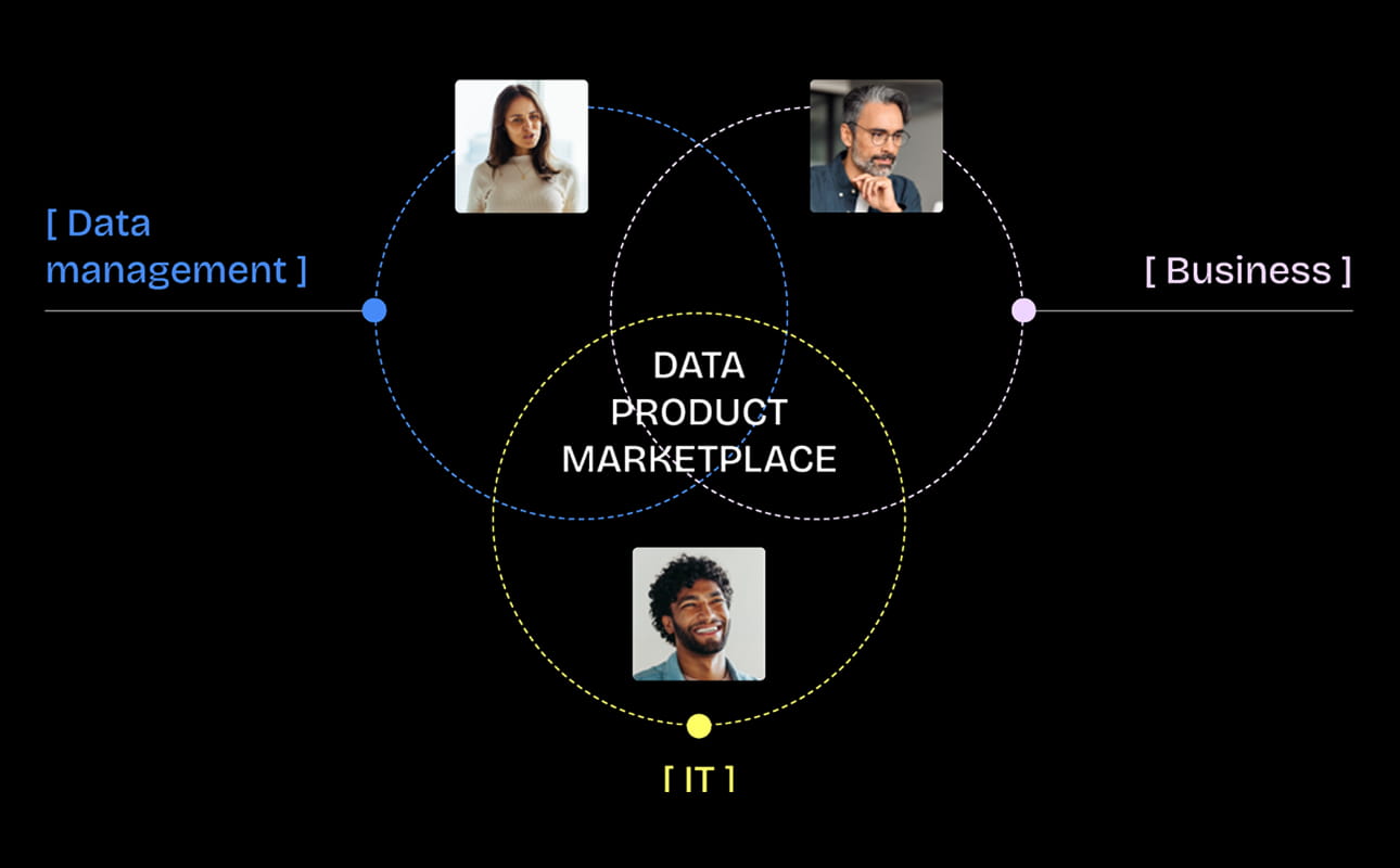 Successfully turning data into value requires collaboration across the organization. Data management, business, and IT teams need to work together to create, share, and consume highly available, understandable, and trusted data products with both humans and AI.