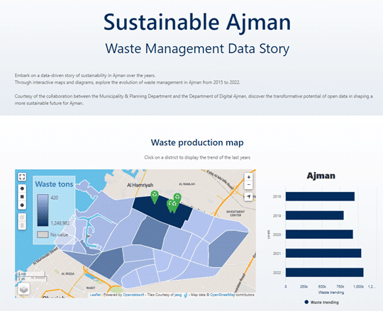 Another innovative use case is around sustainability and waste management, created through a collaboration between the Municipality & Planning Department and Digital Ajman. Delivered through an interactive, comprehensive data story, this provides citizens with information on how the emirate is handling sustainability and building a circular economy. It encourages citizens to recycle more and highlights the facilities that have been put in place to make Ajman more sustainable. Building on this, students have created their own waste management dashboards, helping deepen and increase sustainability efforts.