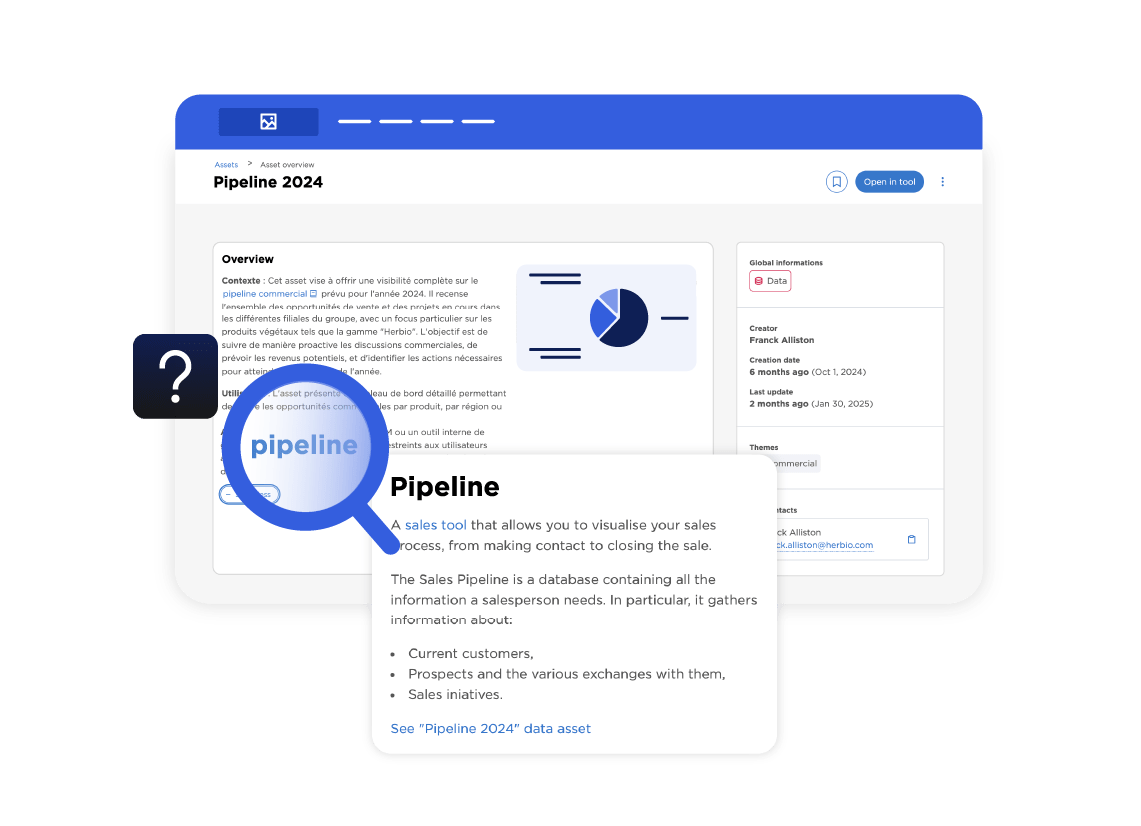 Provide your users with the essential context required to quickly understand your data and assess its relevance to their needs, increasing self-service data consumption and reducing queries to data teams. Accelerate the creation of a data culture by providing users with everything they need to build trust in your data. Optimize the onboarding of new employees by allowing them to confidently consume data as soon as they arrive, saving time and delivering faster impact.