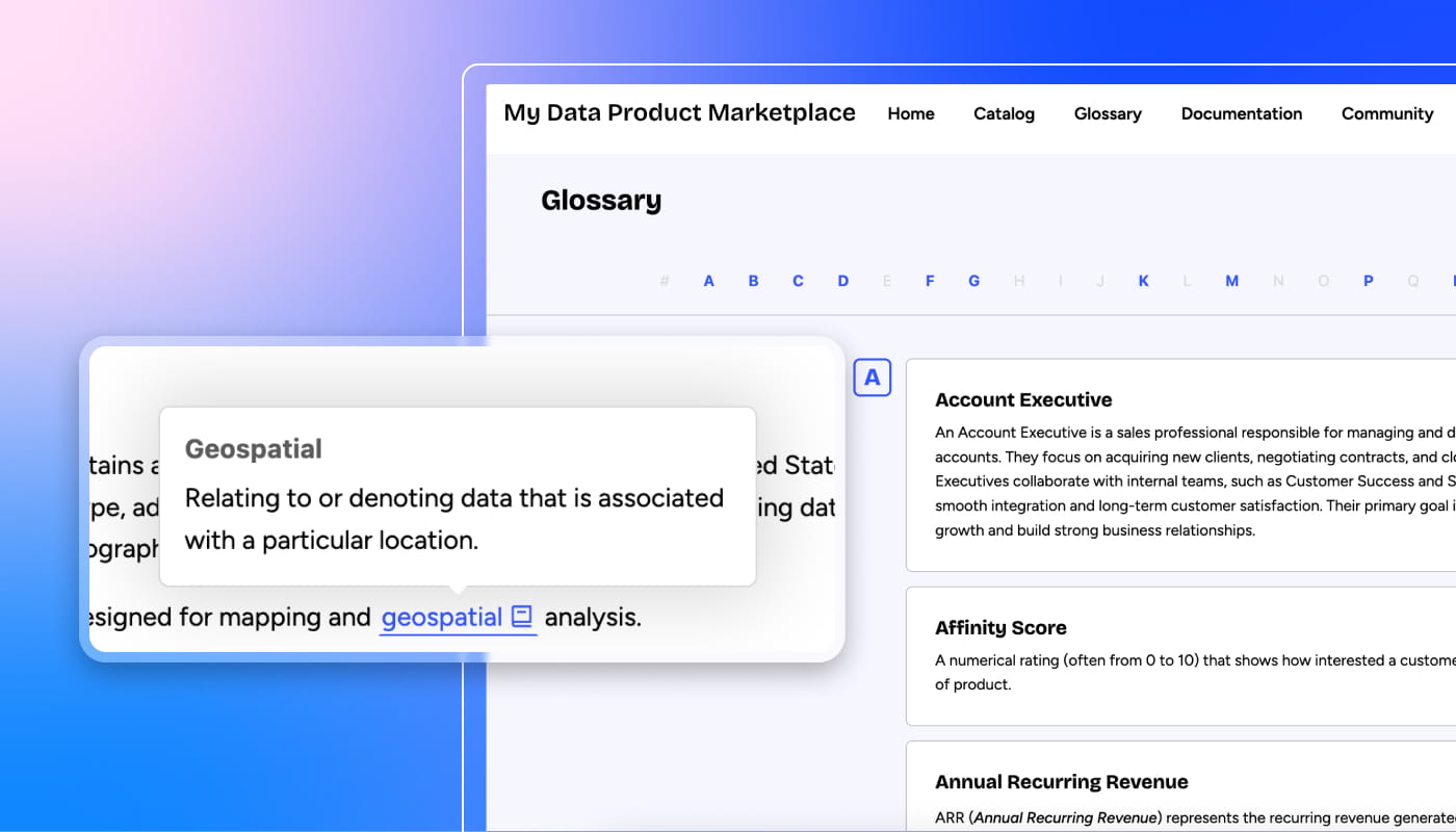 Optimized user experience: As the glossary is directly accessible on the data marketplace, through both a centralized page listing all definitions and on each data description page, users benefit from seamless context when exploring data.