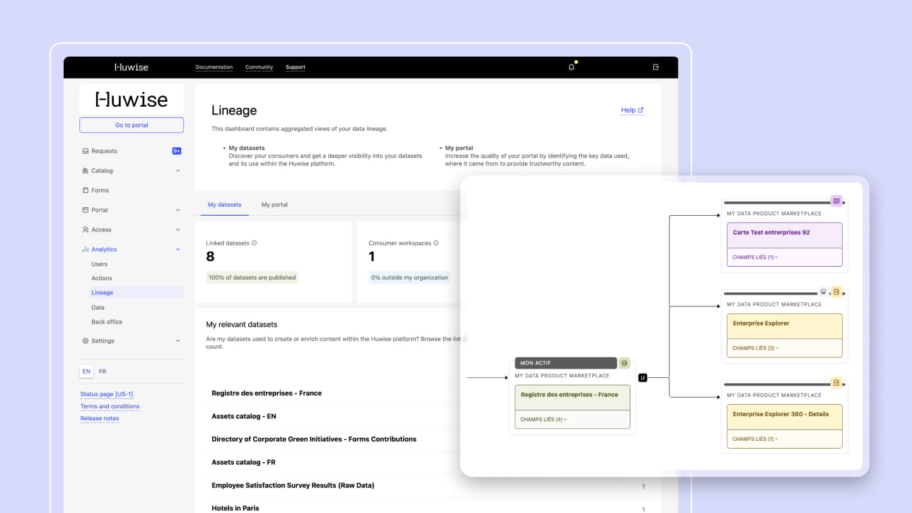 Accessible directly from the back-office of your data portal, Huwise’s data lineage functionality provides detailed mapping of the path your data takes. It models the dataset journey from its creation to final destination, providing information on its origin and its different reuses, both internally on your data portal and externally outside your organization.