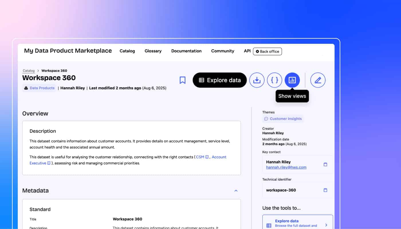 Create and distribute reliable, impactful data products in just a few clicks through integrated data marketplace features. Add custom data views, integrate data contracts, and share use cases, while increasing product visibility by highlighting them on the homepage or marketplace catalog. Huwise provides a complete suite of tools to maximize the accessibility and understanding of your data products, promoting their large-scale adoption by business users.