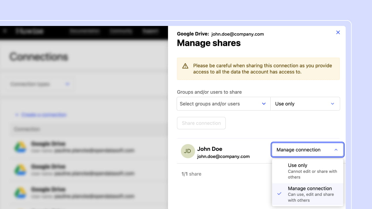 Save your connections to FTP and HTTP servers and business applications like SharePoint or Google Drive. Reuse your shortcuts securely to create other datasets.