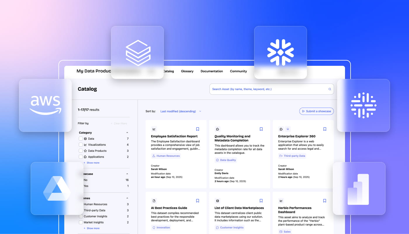 • A data marketplace integrates with all your sources through native connectors covering business tools, data lakes, and BI platforms to centralize your data. It also uses a customizable API to handle specific cases and ensure scalability. This provides unified and secure access to your data on a single portal.