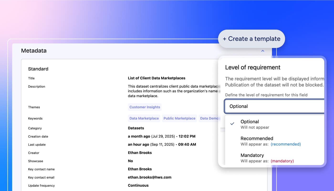 Thanks to Huwise's metadata management feature, we have implemented a custom data model that allows us to efficiently manage our specific metadata, such as time periods, confidentiality level, and the names of data owners or data stewards. This optimizes the operational management of our platforms, simplifies data updates, and provides us with true autonomy, saving us valuable time. Additionally, configuring the models is simple and intuitive, especially with the ability to make certain fields mandatory in the model to avoid entry errors.