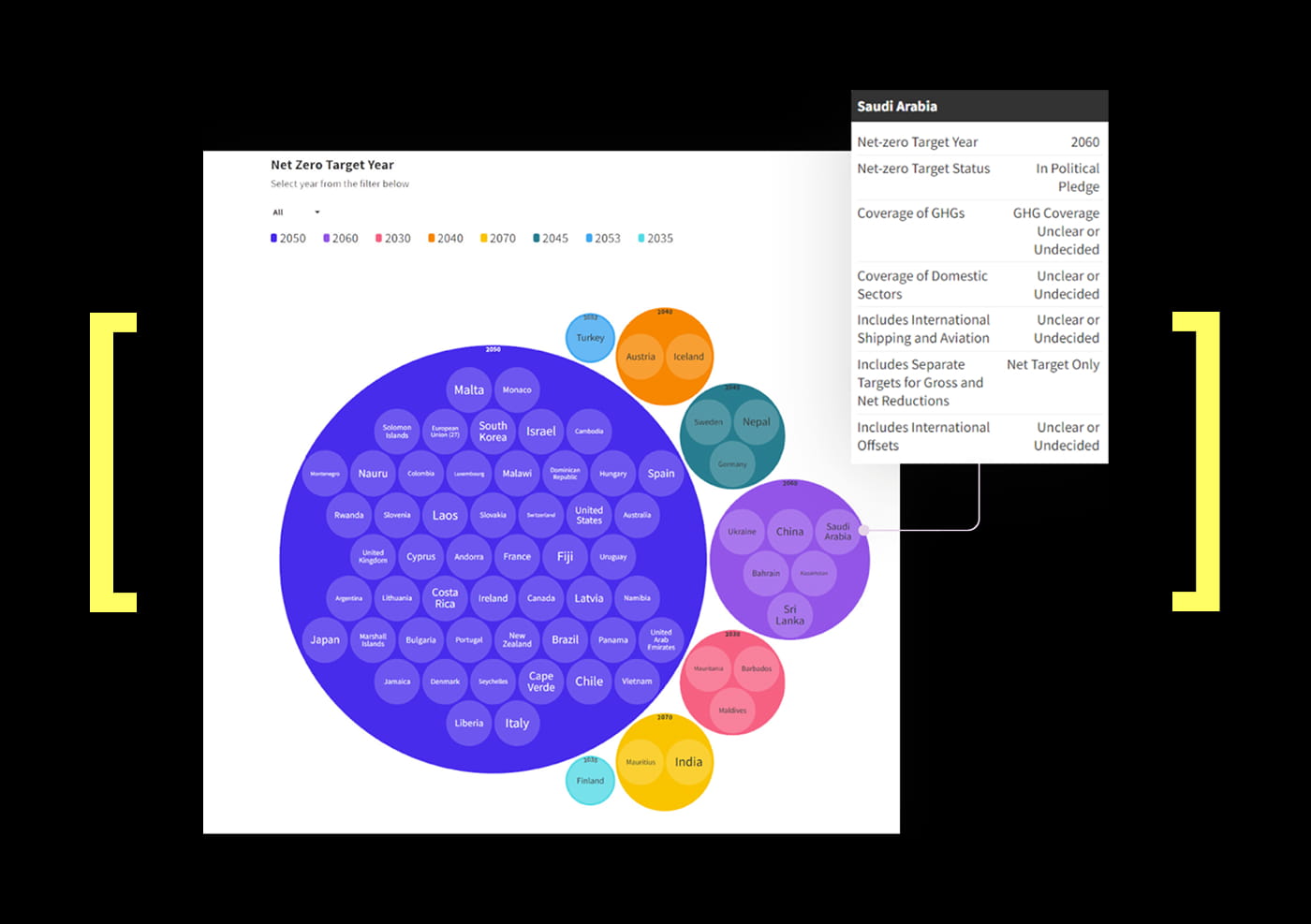 Understanding progress towards Net Zero is a key objective for KAPSARC, and the data marketplace provides a range of datasets that include information on country targets, historic emissions and a range of mitigation measures, such as hydrogen and renewable production. As these are designed to appeal to a wider audience, they are visualized through infographics and dashboards, providing an at-a-glance view of Net Zero targets, what they cover and when they will be achieved.