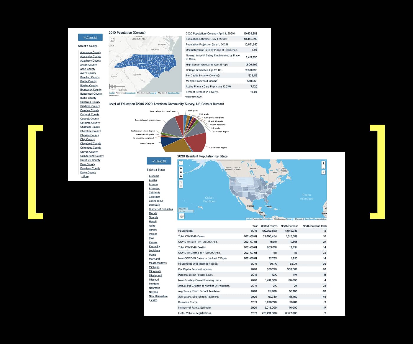 Putting data in context is central to increasing its impact and making it understandable to all. Consequently, we are showcasing how data drives life in North Carolina by producing regular data stories on topical subjects. Often linked to specific events, such as Black History Month, these stories use data to enable users to explore a subject through accessible data visualizations that bring information to life. In addition to creating our own data stories, OSBM showcases those created and submitted by the community, widening the reach of data to all.
