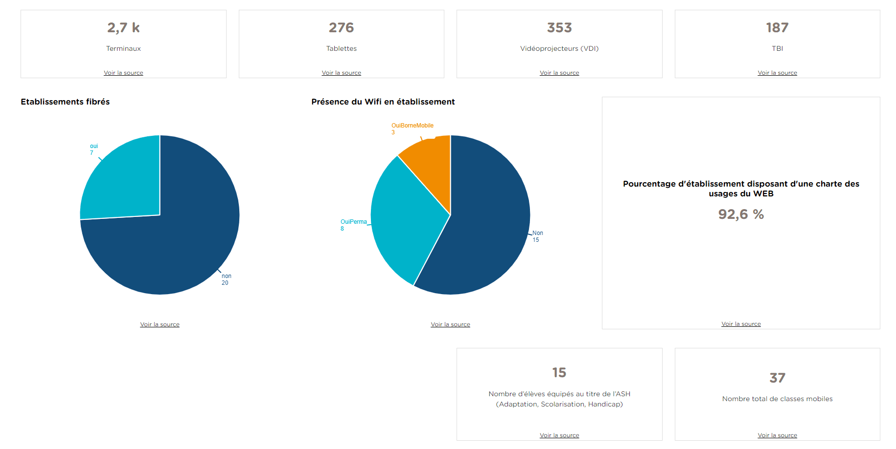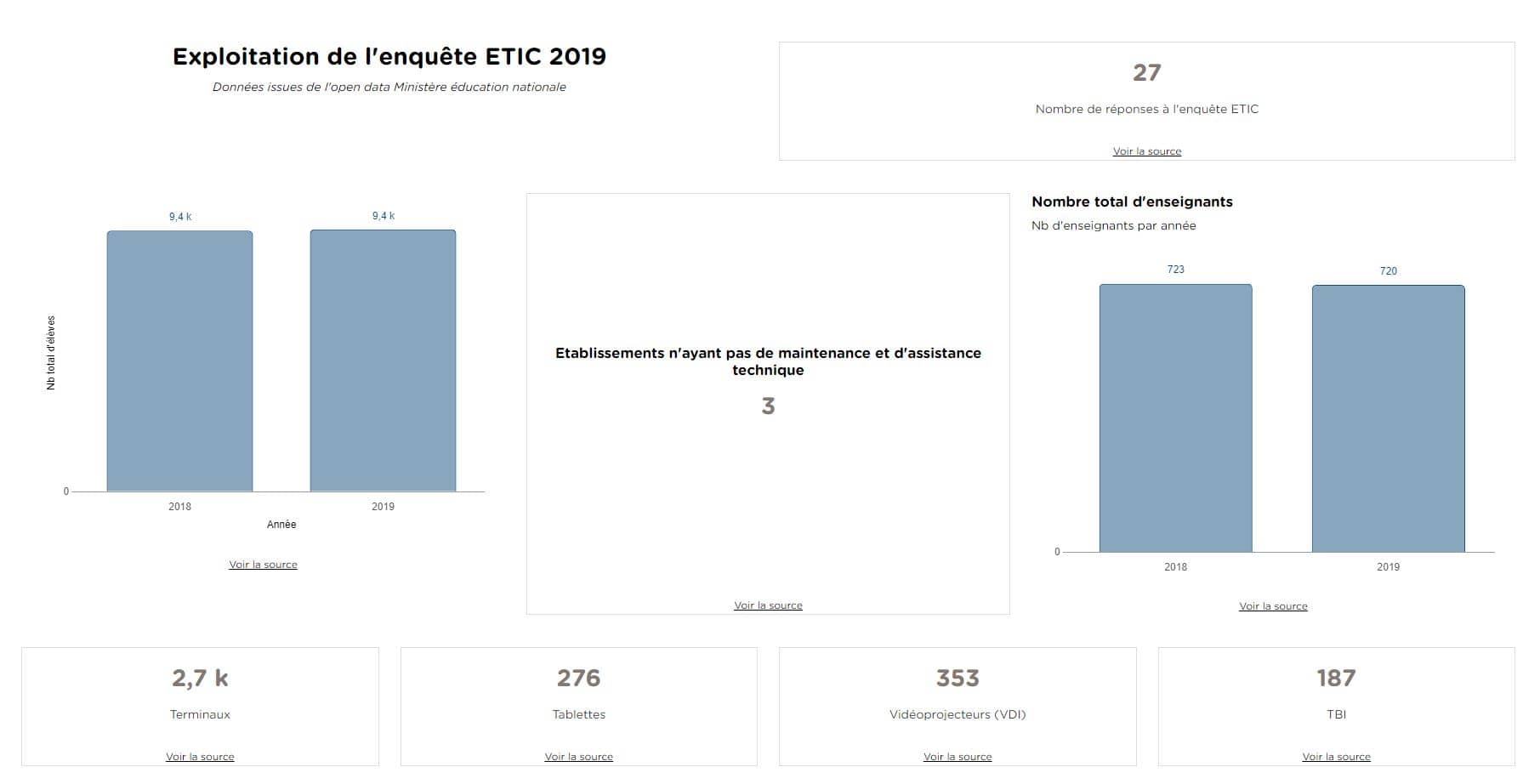 Le premier permet de comprendre le contenu d’un dataset ouvert par le Ministère de l’Education nationale : l’Enquête ETIC 2nd degré. Cette enquête a été menée auprès des établissements scolaires au sujet des équipements numériques. En visualisant les résultats dans un tableau de bord, nous voulions observer ce qui était remonté par les établissements de la Mayenne au niveau national, et comparer ces résultats aux informations dont nous disposons. C’est en effet le département qui assure la fourniture, l’assistance et l’accompagnement des établissements scolaires publics du territoire en matière de numérique.