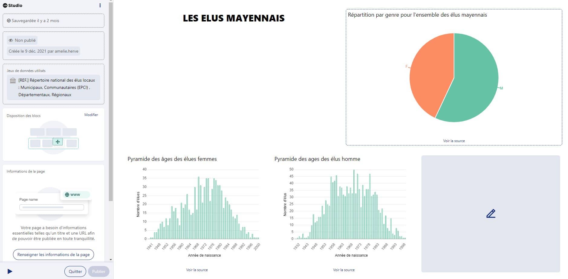 L’un de nos objectifs est aussi d’observer de quelle manière des tableaux de bord déjà développés pourraient être améliorés et conçus plus rapidement grâce au Studio. D’autres réalisations sont donc en cours de test, comme cette page sur le profil de tous les élus en Mayenne.