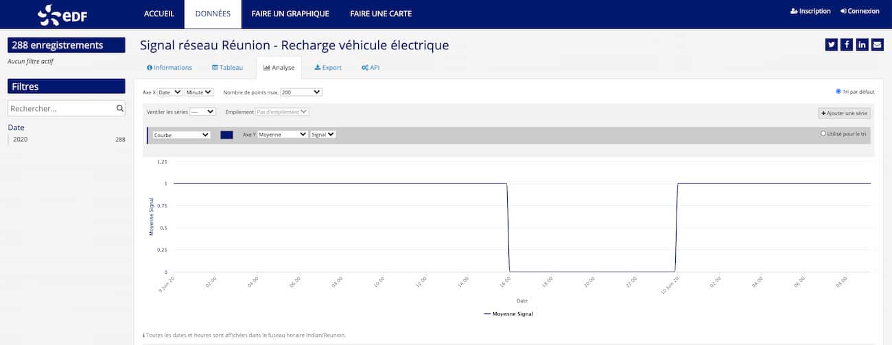 On met à leur disposition un signal à 2 niveaux : le niveau 0 indique une période défavorable (le moment n’est pas adapté pour la charge) et le niveau 1 une période favorable à la recharge. Ce signal est visible sur nos plateformes open data (il en existe une par territoire) et peut être transmis en temps réel aux bornes de recharge.