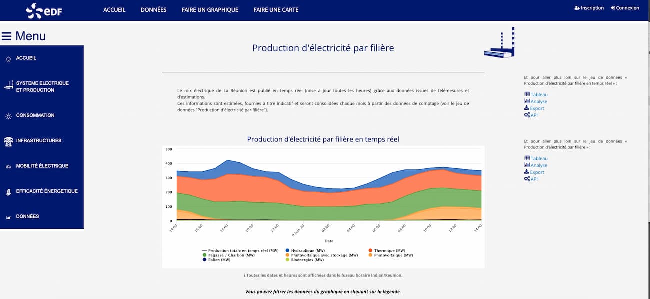 Oui ! Nous publions en temps réel les données relatives au mix de production du territoire de La Réunion. Ce cas d’usage a beaucoup plu et a été repris par la plateforme Electricity Map – un site sur lequel on peut surveiller le taux de CO2 moyen émis par la production d’électricité dans différents pays. Nous comptons étendre ce cas d’usage à d’autres territoires SEI dans les mois à venir.