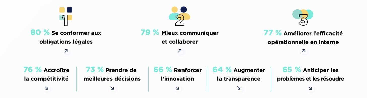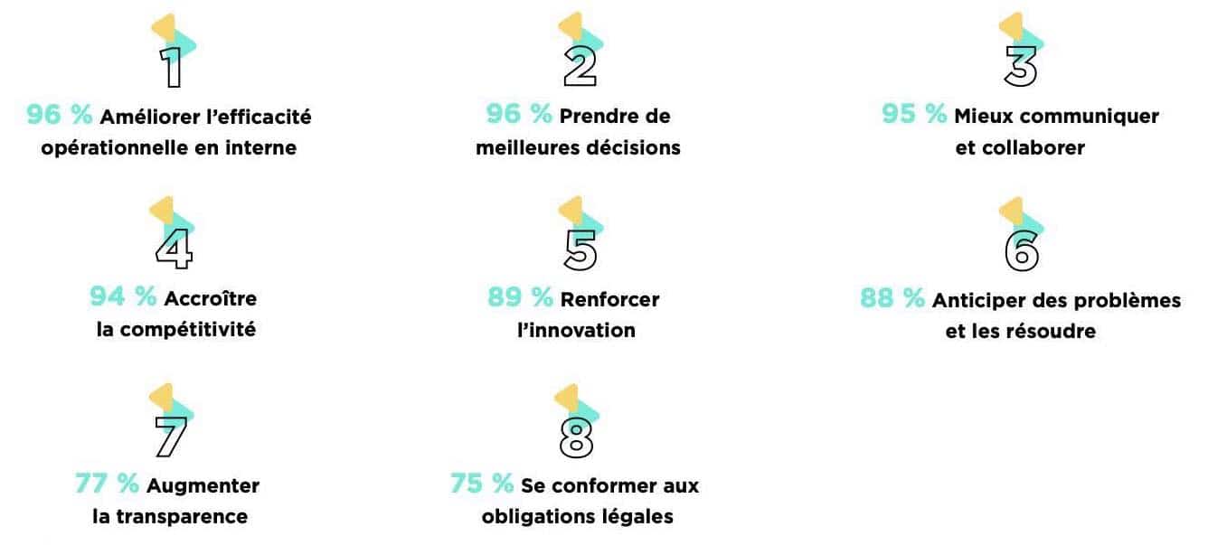 Cela traduit les principaux challenges des organisations qui s’engagent dans des projets data : la valorisation de la collaboration autour des données en interne et le besoin de transparence, la volonté d’améliorer les services et produits et la recherche de revenus additionnels.