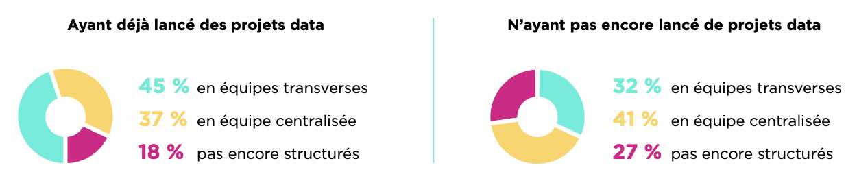 On observe que les répondants qui n’ont pas encore lancé de projets data se projettent plutôt avec une organisation centralisée. Cette structuration permet, en effet, aux organisations qui débutent de centraliser le savoir et de mobiliser moins de ressources que la mise en place d’équipes transverses.