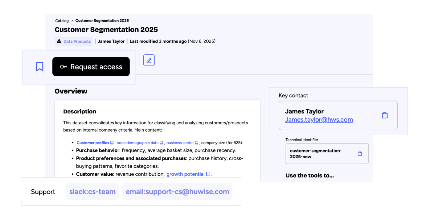 • Collaboration entre équipes métiers et data : même avec des accès restreints, les utilisateurs peuvent facilement contacter les responsables des jeux de données, favorisant la coopération et le partage de connaissances sans compromettre la sécurité.