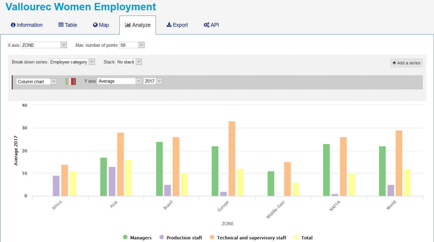 Le partage de données sur la diversité peut également être remplacé par le lancement de votre propre portail de données ouvertes sur les considérations ESG, comme le font déjà certaines entreprises européennes. Comme exemple, citons Vallourec, une entreprise de fabrication de tubes en acier multinationale basée en France, qui en 2019 a commencé à publier des informations sur les considérations ESG sous la forme de données ouvertes. Le groupe a choisi de mettre l’accent sur les indicateurs sociaux, en particulier en ce qui concerne l’emploi des femmes, avec deux objectifs en tête : donner de la substance et de la visibilité à ses engagements en matière de responsabilité sociale d’entreprise, et structurer les informations nécessaires pour élaborer des politiques de diversité et d’intégration ciblées, significatives et basées sur les faits.