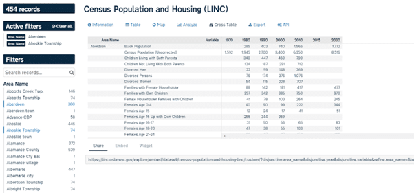 L’Office of State Budget and Management (OSBM) de Caroline du Nord collecte et met à disposition sur son portail LINC d’énormes volumes de données statistiques provenant de 20 départements de l’État et d’agences fédérales. Ces données couvrent des domaines aussi divers que la population (y compris les données de recensement), la main-d’œuvre, l’éducation et l’agriculture. L’OSBM utilise des informations telles que les données de recensement pour enrichir ses propres données, ce qui leur confère une plus grande profondeur et permet aux utilisateurs, tels que les élus locaux, de bénéficier d’une vue plus complète de leur comté ou de leur municipalité.