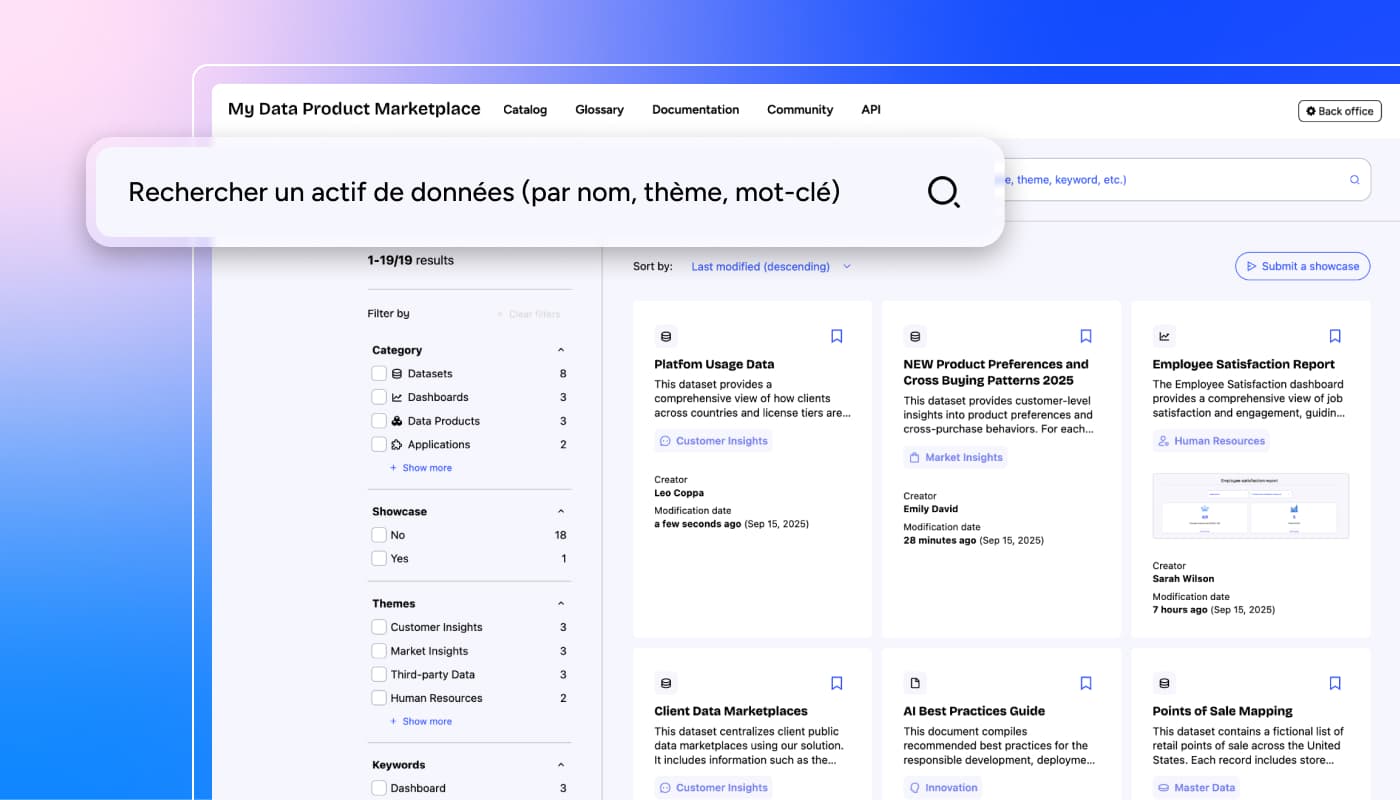 Il n’y a rien de plus frustrant pour un utilisateur que de ne pas trouver une donnée utile, bien qu’elle soit disponible. Une recherche performante fait toute la différence. C’est pourquoi nous mettons un accent particulier sur la qualité de la recherche grâce à nos fonctionnalités alimentées par l’IA, offrant une grande autonomie aux utilisateurs et maximisant leurs chances de trouver rapidement les données pertinentes pour leurs besoins. Assurez une expérience fluide, digne des meilleures plateformes e-commerce, grâce à un moteur de recherche sémantique capable de comprendre le sens des requêtes, même approximatives ou dans une langue étrangère. Enrichissez l’expérience de découverte au sein du data catalog avec des recommandations de données similaires, prolongeant ainsi le parcours de navigation pour maximiser la consommation et l’impact de vos données.