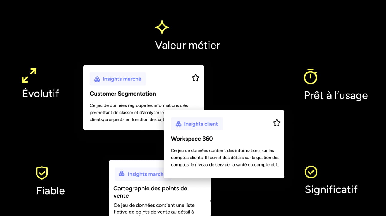 Les data products sont des actifs de données à forte valeur ajoutée, conçus selon des standards exigeants en matière de présentation, lisibilité, qualité et fiabilité. Leur vocation ? Fournir des informations stratégiques essentielles à un large public sur une data product marketplace. À l’image des best-sellers de votre patrimoine de données, ces ressources à forte valeur pour les métiers doivent être packagées comme de véritables produits et se démarquer au sein de votre data product marketplace, afin de maximiser leur impact et révéler tout leur potentiel.