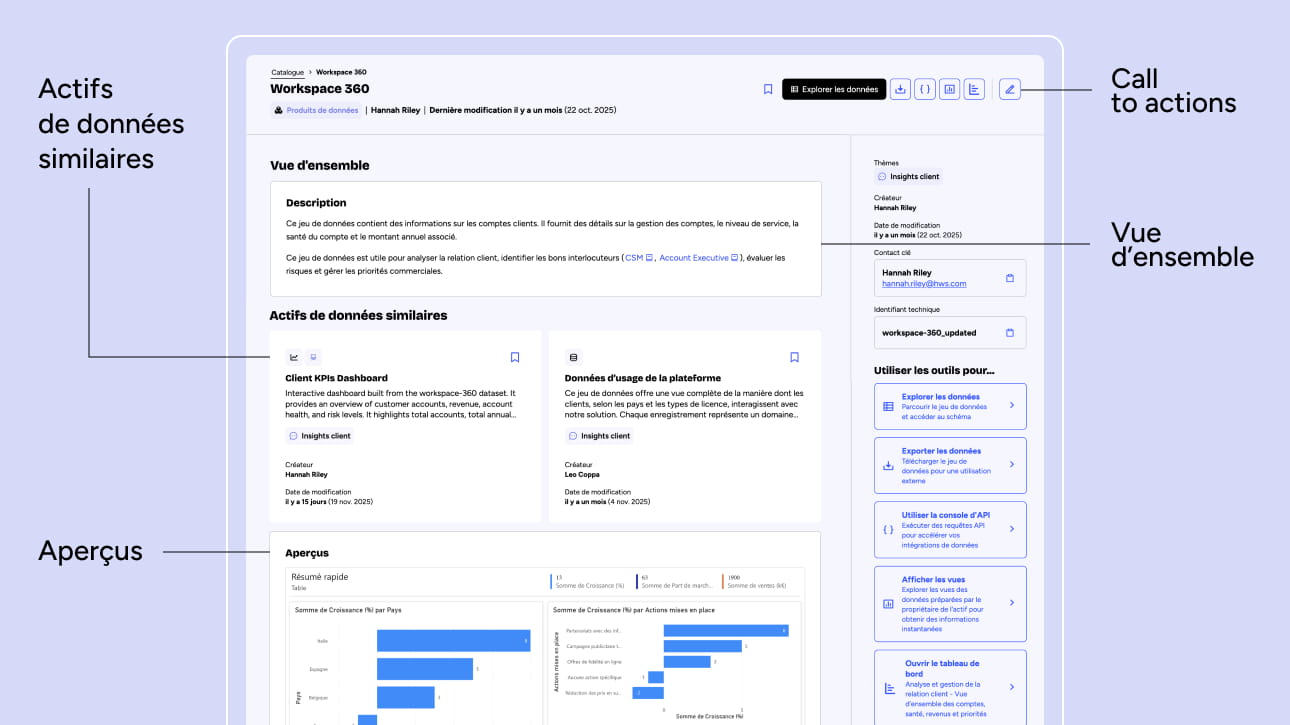Un data product doit être traité comme un produit pour générer un véritable usage par des consommateurs finaux, avec une présentation soignée, attrayante et intuitive pour captiver l’attention. Créez des pages de présentation dédiées, personnalisées pour chaque data product, et mettez en avant les informations essentielles sur son contenu et son utilisation de manière claire et engageante en quelques clics. Cette approche stratégique vous permet de maximiser l’exploitation de vos data products, d’assurer une adoption rapide et d’obtenir un impact immédiat, en garantissant leur succès auprès de vos utilisateurs.