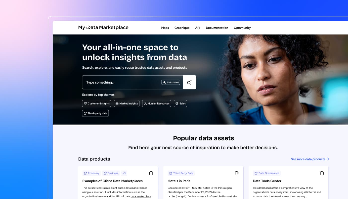 Offrez à vos data products et actifs de données la vitrine qu’ils méritent sur une data product marketplace dédiée aux utilisateurs métiers et à l’IA. Proposez à toutes vos parties prenantes des données prêtes à l’emploi, en self-service, via une plateforme centralisée, sécurisée et intuitive qui réinvente l’accès à la donnée et la transforme en source de valeur, de performance et de connaissance.
