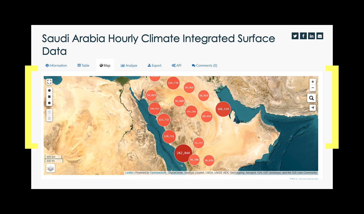 - Accroître l’engagement à travers le monde : En surveillant les adresses IP, nous constatons que le portail est utilisé par une audience mondiale. Les visiteurs proviennent de 160 pays, les plus nombreux venant d’Arabie saoudite et d’Amérique du Nord. Depuis son lancement, la data marketplace a connu une croissance spectaculaire en termes de partages, passant de 8 000 à 210 000 téléchargements depuis 2016, avec plus de 5 millions d’appels API par an.