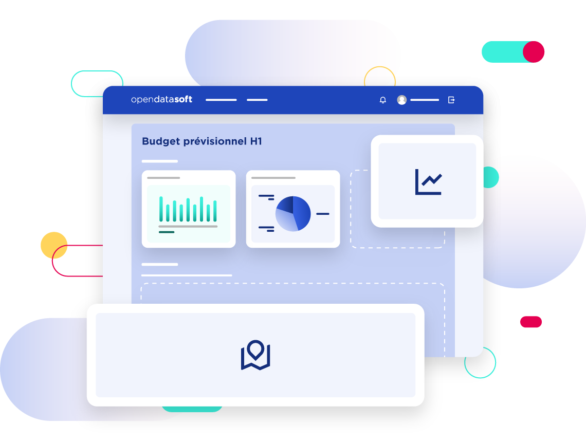 Le studio no-code permet d’intégrer et de générer, en un clic, une large variété de blocs tels que des cartes à points, des cartes choroplèthes, des indicateurs, des graphiques et même des vues tabulaires de jeux de données, afin de créer des datavisualisations personnalisées.