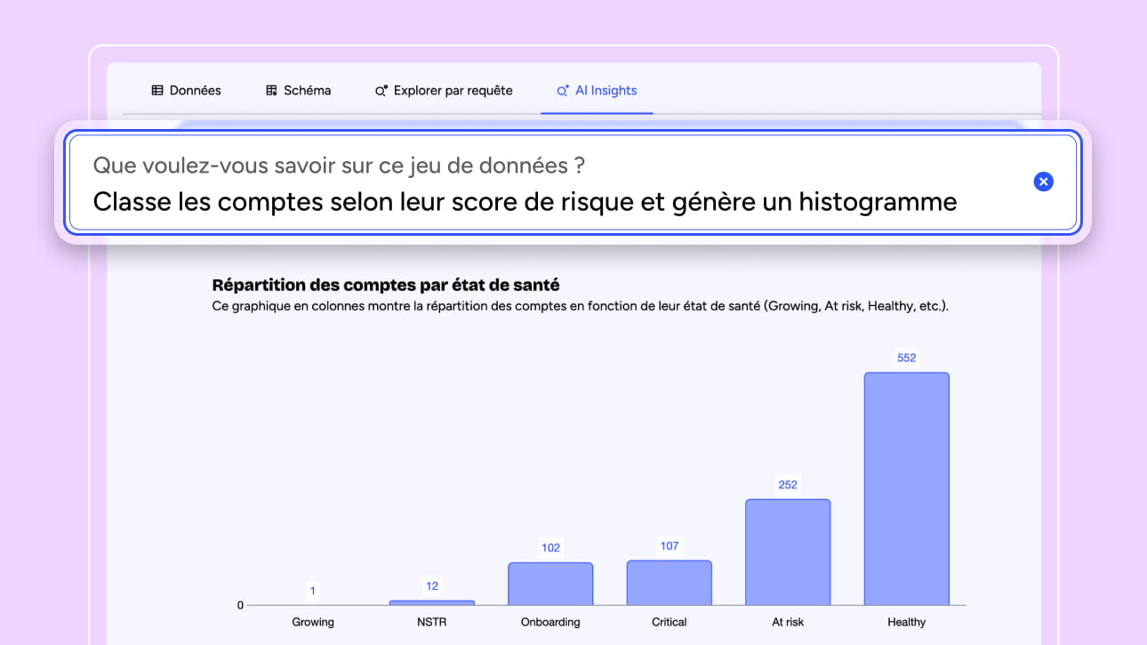 Économisez un temps précieux dans la création de vos visualisations de données grâce à notre assistant virtuel basé sur l’IA. Il génère automatiquement une variété de blocs, incluant des cartes, des indicateurs ou encore des graphiques, en répondant simplement à des questions posées en langage naturel. La création de data visualisations n’a jamais été aussi simple et accessible.
